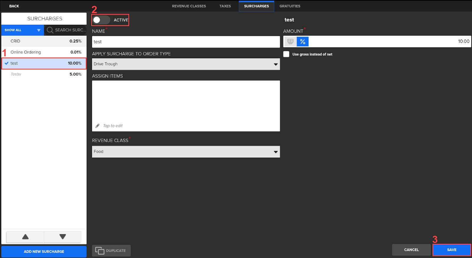 - If you are editing an existing surcharge, select the surcharge from the list on the left side of the screen, make the proper adjustments, and tap Save to commit the changes.