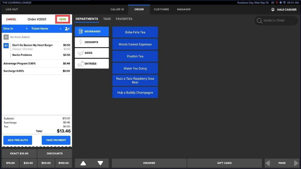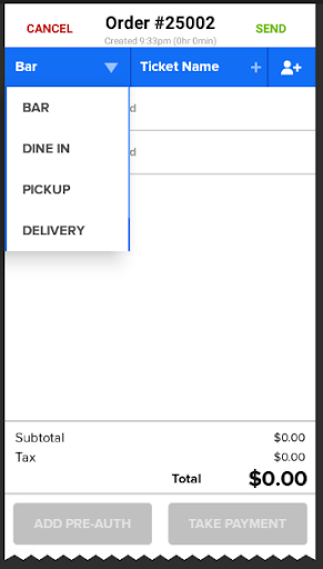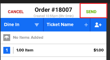- If payment is not going to be taken immediately, tap the Send button to submit the ticket. The ticket is stored until it needs to be recalled for payment or to add additional items. Items are also sent to any remote printers you have configured, such as a Kitchen Printer.