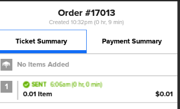 Once committed, any items that have been added are sent to the remote or expedite printers (if applicable). Additionally, after committing a ticket, the Sent timestamp displays near each item, indicating that items were successfully printed at the remote printer.