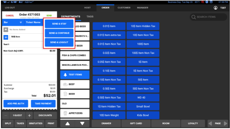 - Send & Stay: Send existing ticket items and stay within the current open ticket.