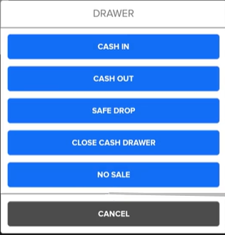 The following functions are available to use for users with the appropriate permissions and are accessed by selecting Cash Drawer from the Order Entry screen. The Cash Drawer functions include Cash In, Cash Out, Safe Drop, Close Cash Drawer, and No Sale.