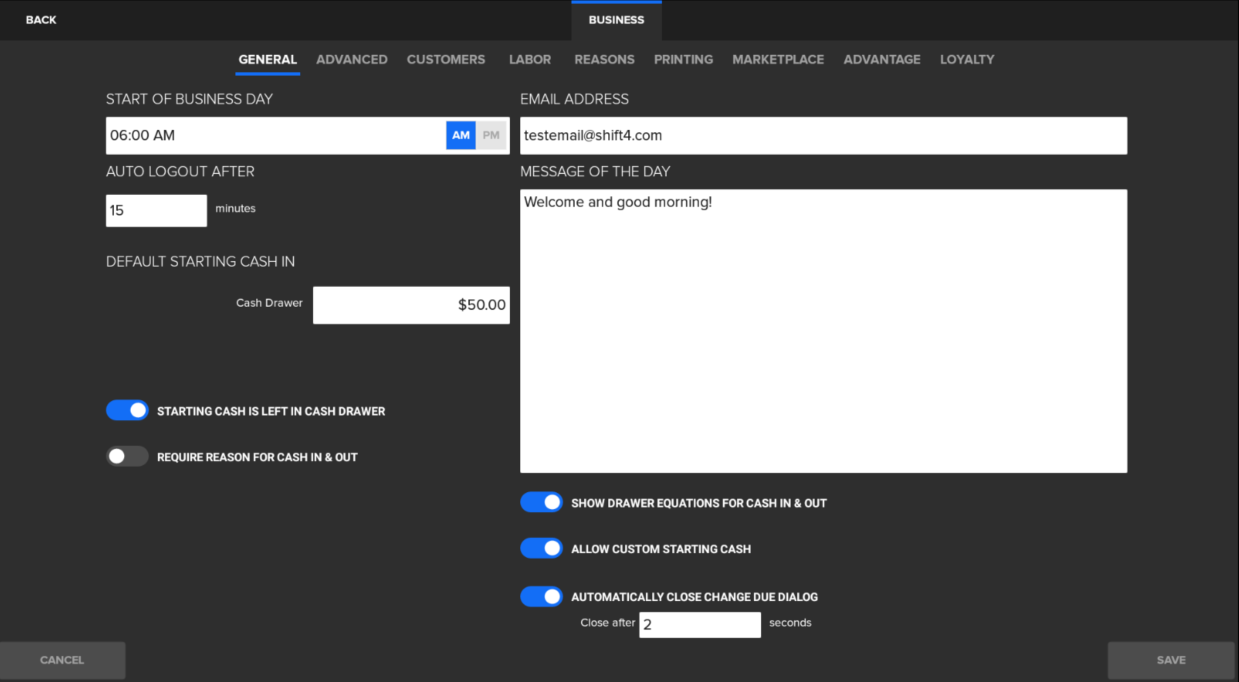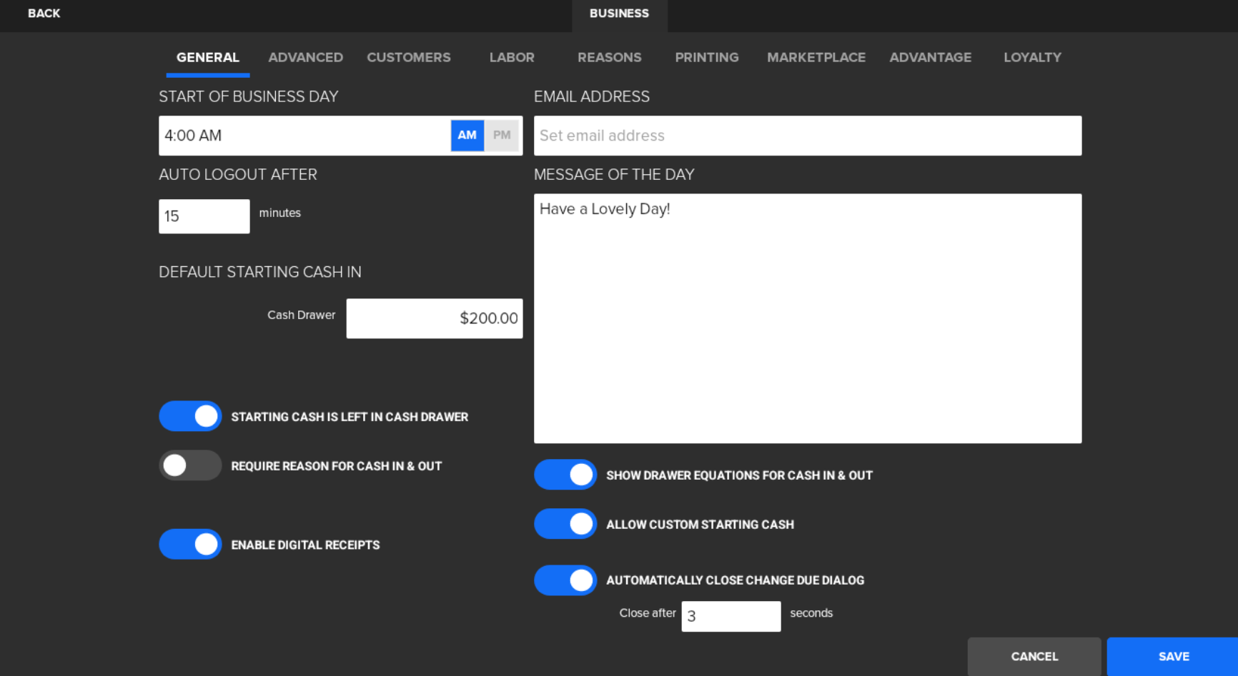 - Start of Business Day: Designate the reset for End of Day, Cash Drawer Management, and Ticket Management.