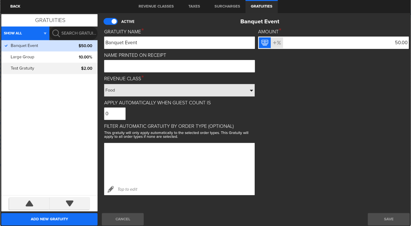 Gratuity Name: Enter a descriptive name. Including the percentage or amount in the name makes it easier to identify when applying it to a ticket.