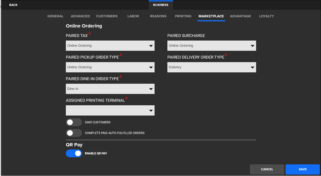 The Marketplace tab allows you to edit Marketplace integration settings for online ordering. This sets up the taxes, supplemental fee, and order types to pair up with the settings on the POS.