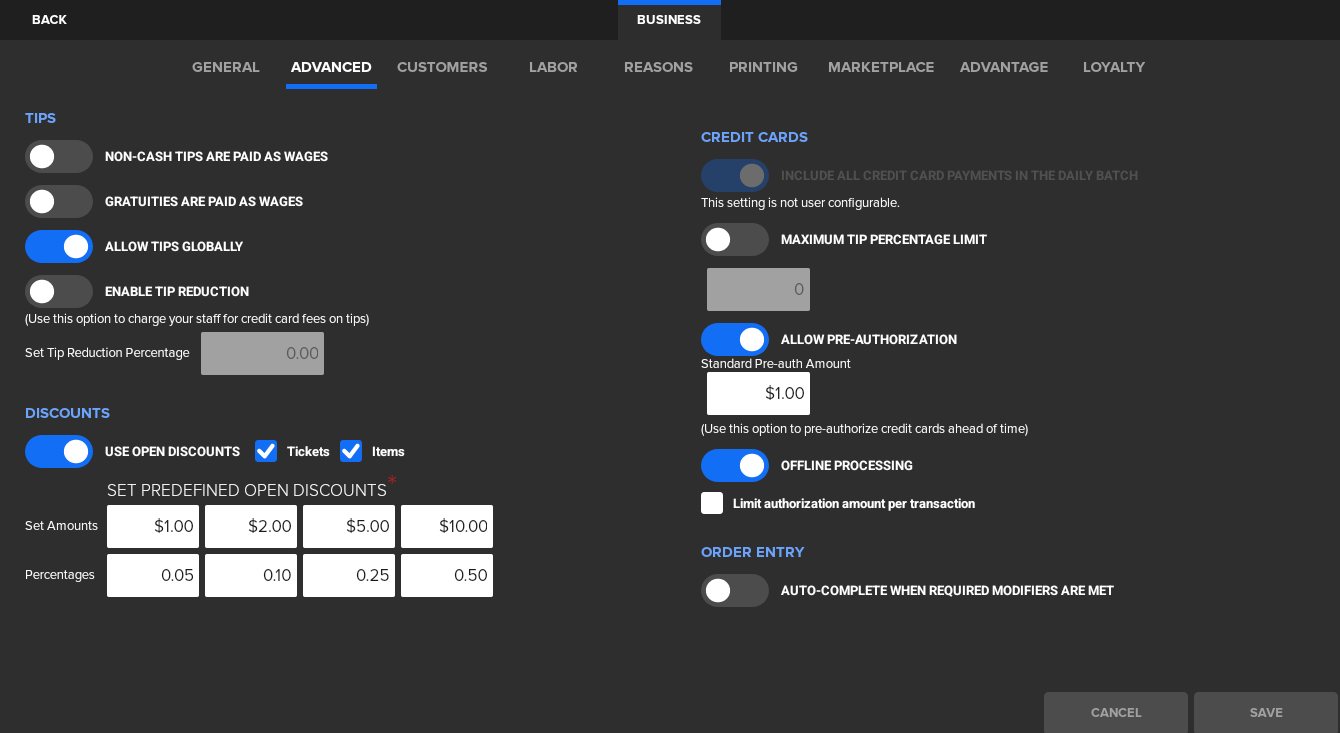 The Advanced tab allows you to configure how tips and discounts work, how credit card payments are accepted, and whether or not Host Mode is enabled.