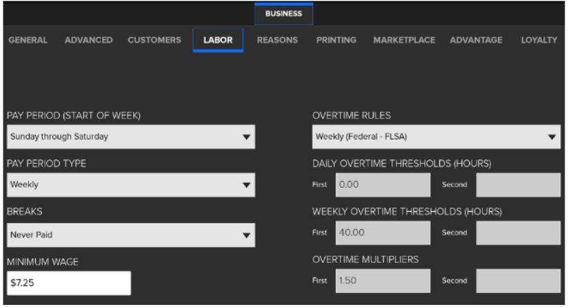 The Labor tab allows you to adjust labor settings within the system. From here, you are able to set the day that the pay period starts, configure how overtime is calculated, and whether or not breaks are paid.