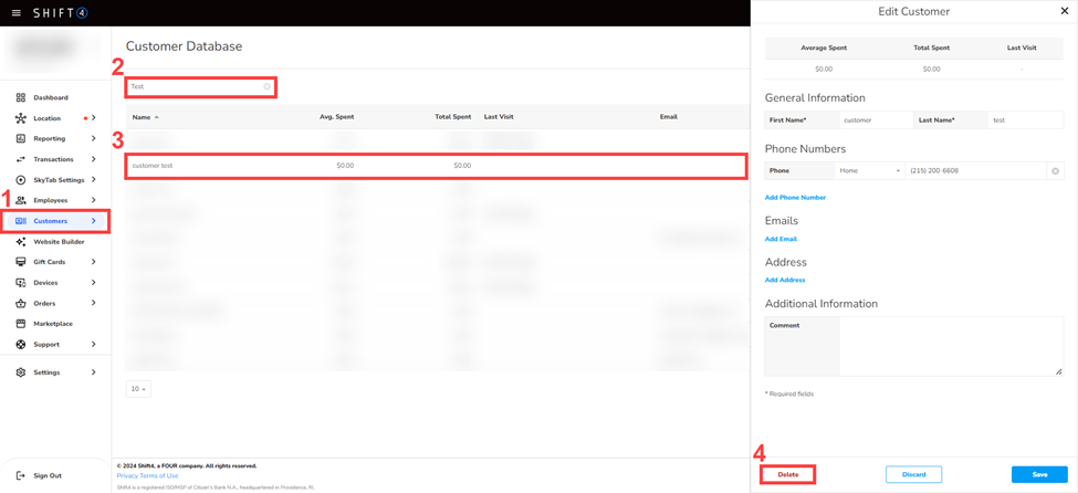 The POS Terminal does not allow you to delete customers from the customer database, but it is possible via Lighthouse.