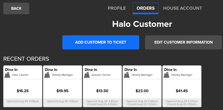 This gives you options to Add Customer To Ticket or Edit Customer Information. It also shows any recent orders.