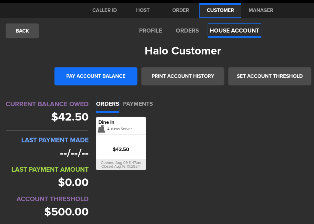 If this feature is enabled in the Manager Business Settings, this controls the customer house account information. This page also displays the Current Balance Owed, Last Payment Made, Last Payment Amount, Account Threshold, Orders, and Payments. There are also options to Pay Account Balance, Print Account History, and Set Account Threshold.