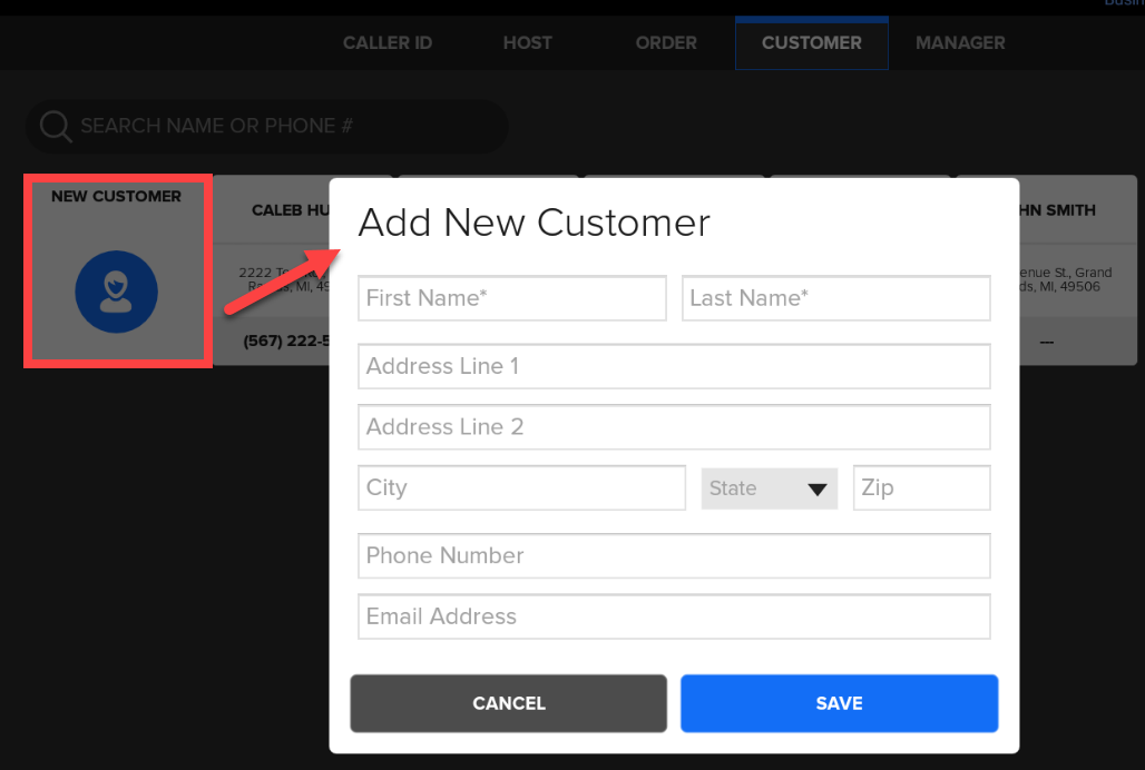 To add a new customer to the system, select New Customer. Fill out the mandatory fields as determined under the Business Settings. Select Save to commit the changes.