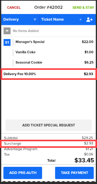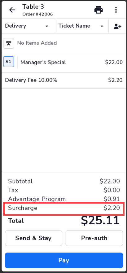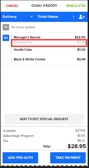 - Automatically applies when a qualifying order type is selected (for example, Delivery).