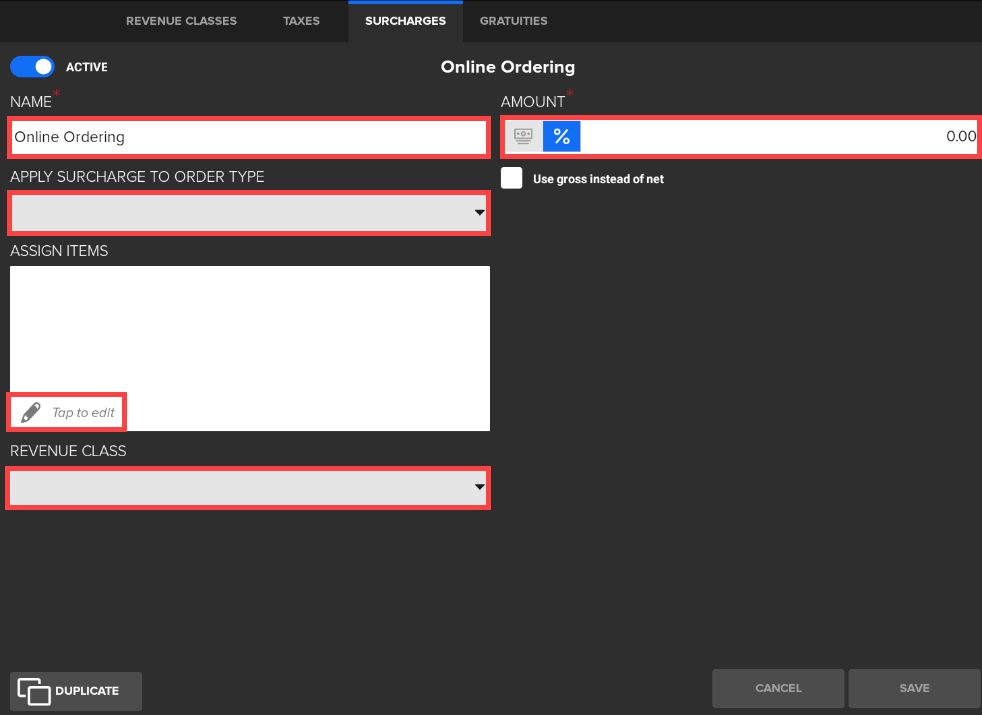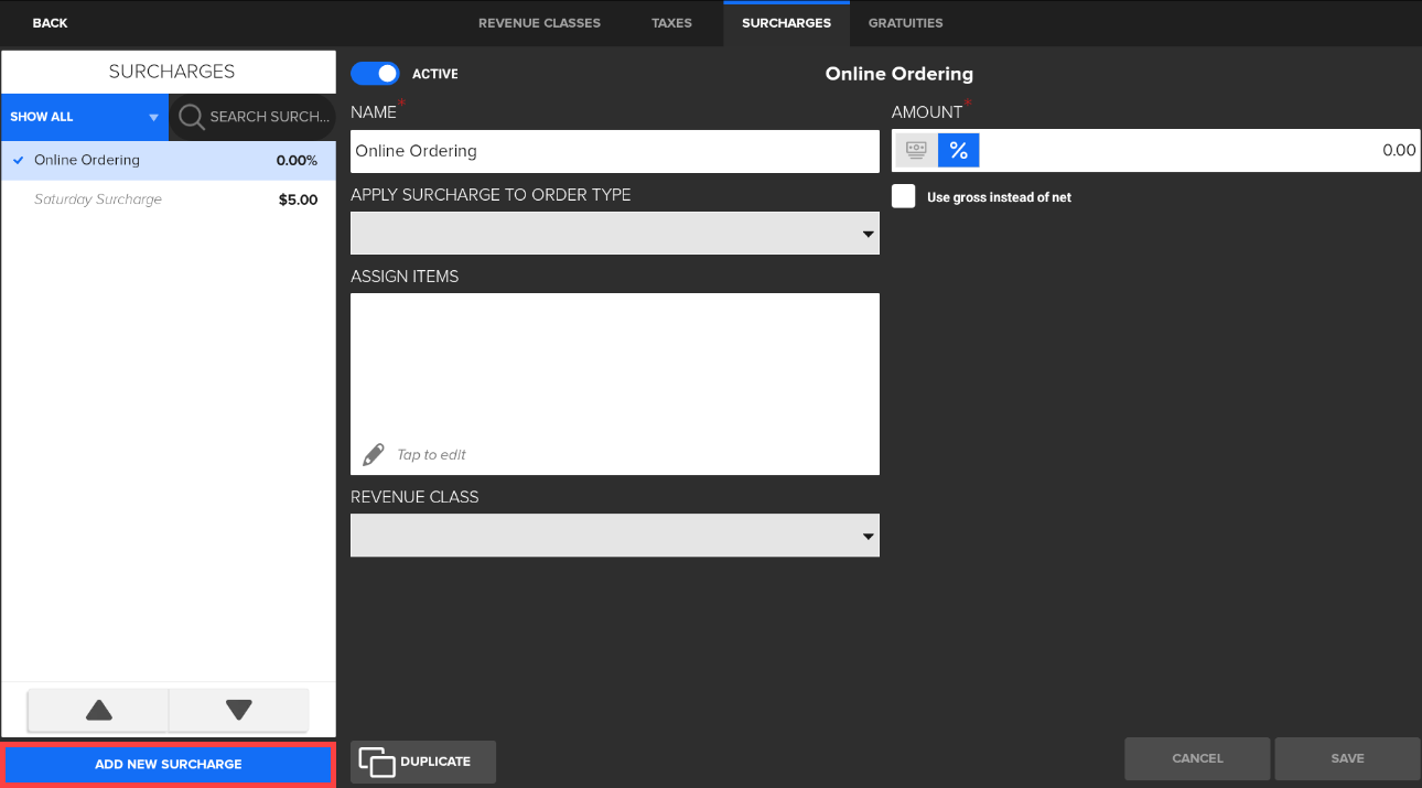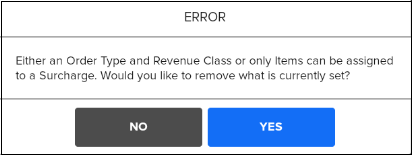 Note: A surcharge can be configured either by Order Type and Revenue Class or by assigning specific items, but not both at once. If you switch between these options, the system prompts you to remove the existing configuration.