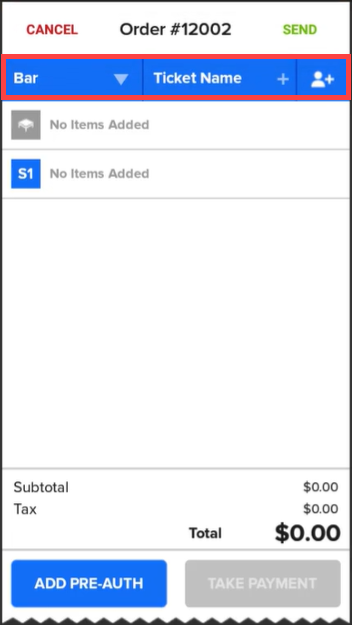| In the next area is the assigned order type (Dine In, Bar, etc.), ticket name, and if a customer is assigned. You can tap on any of these fields to change them. |