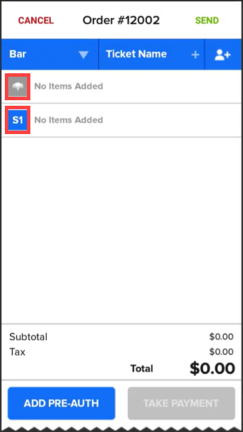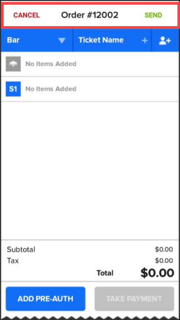 Send: Selecting 'Send' will save the ticket to the POS and send any items that are set to print at order printers if they have not already been sent. |