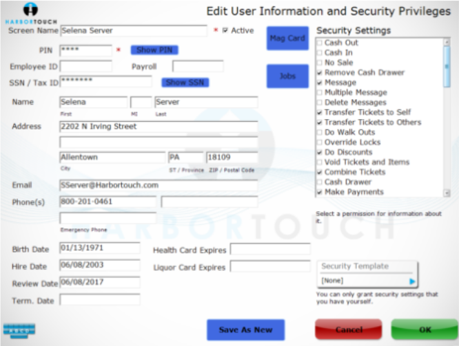 Description: In the Hospitality system, each system user should be created as an employee, after which time you can assign them different jobs, PIN codes and restrict or grant them access to different features in the system.