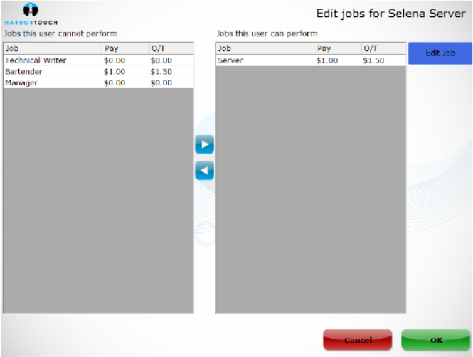 - Assign jobs to this employee by selecting jobs on the Jobs this user cannot perform and transferring them to the Jobs this user can perform side of the screen using the left and right arrow buttons.
