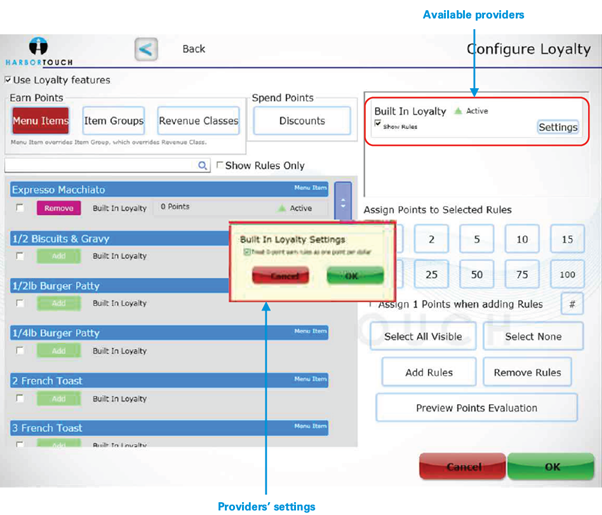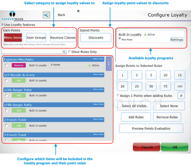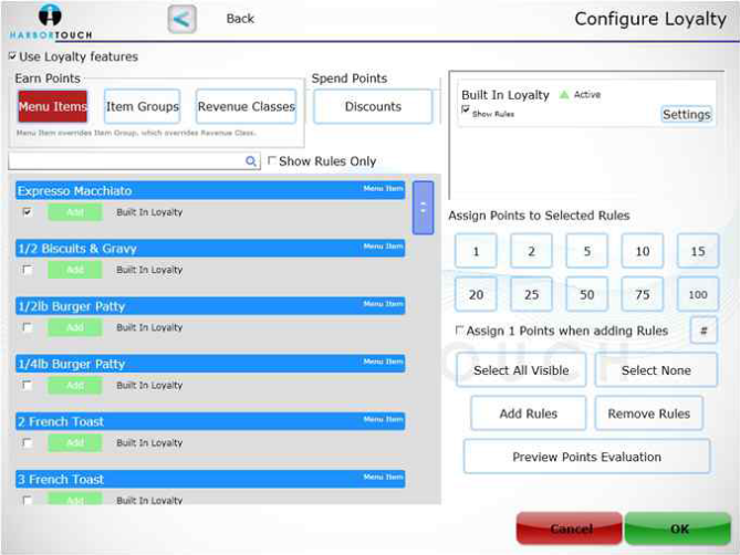 ‘Points’ are earned and spent through the application of ‘Rules,’ which must be created. ‘Earning Rules’ are associated with ‘Menu Items,’ ‘Item Groups,’ or ‘Revenue Classes.’ ‘Spending Rules’ are associated with ‘Discounts.’ By default, all Menu Items, Item Groups, Revenue Classes, and Discounts are shown.
