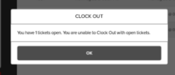 If an employee tries to clock out of the POS terminal and they have open tickets, they will receive an error message when clocking out.