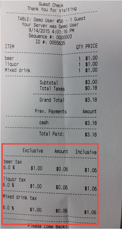 Description: Review how to display taxes separately on a Hospitality receipt. The Value Added Tax, or VAT, may be used in a bar setting to show the difference between alcohol and food tax, or separate taxes based on drink types.