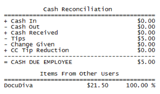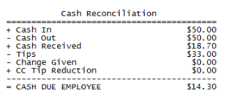 Note: The above example shows CASH DUE RESTAURANT. If the user accepts additional credit payments, so the tip amount becomes larger than the Cash Received, the report will change to read CASH DUE EMPLOYEE, as shown below. The Daily Reports also include similar information for the Employees.