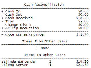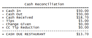 Tips on credit cards and other tenders that allow tips are reconciled for the user automatically. Shift4 assumes that you settle credit card tips with cash for each employee. You do not need to record the transaction when you give the tips to the employee. As shown in the report below, this server had balanced Cash In/Out transactions, $18 in Cash Received, and a Credit Card tip of $5.00: