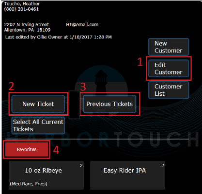 The New Ticket feature will allow you to begin a brand new ticket attached to this customer’s account. Selecting this option will navigate you to Host Mode to select a table (if applicable) or directly to the Order Entry screen to begin adding items to the ticket. You will see the customer’s name listed in the top left corner of the ticket.