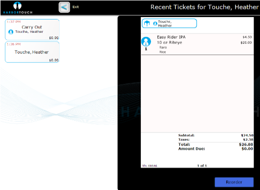 If trying to view the customer’s prior orders, select Previous Tickets to open the Recent Tickets page. Here you can select the tickets on the left and then have the option to reorder the same items for the customer. Selecting this option navigates you back to the Order Entry screen to complete the transaction.