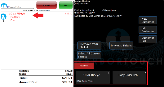 Once a few orders have been processed for the customer, they will have a list of Favorites on their customer profile. This section lists the items ordered as well as the number of times the customer has ordered them. Selecting the item opens a new ticket under the customer’s name with that item attached to it.