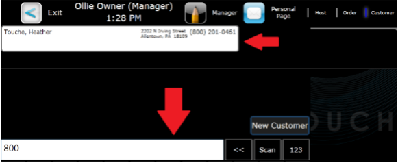Select Customer in the upper right corner. Then on the Customer page, type the customer’s name or phone number into the search bar. When it appears, select the customer at the top of the screen.