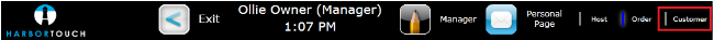 To access the Customer Database, log in to the system using your four-digit PIN and select Customer in the upper right corner of the Order Screen.