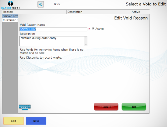 - To create a new void reason, select New in the lower left corner of the screen