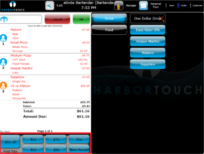 Certain jobs, such as bartenders, have the option of allowing Fast Pay which is designed for fast cash transactions and is typically employed in fast-paced bars and coffee establishments. Fast Pay automatically assumes the payment is cash and instantly displays amounts at the bottom. These quick payment options will include exact change and the closest amount paid in singles, fives, tens, etc. Selecting one of these options will finalize the transaction and display the change due.