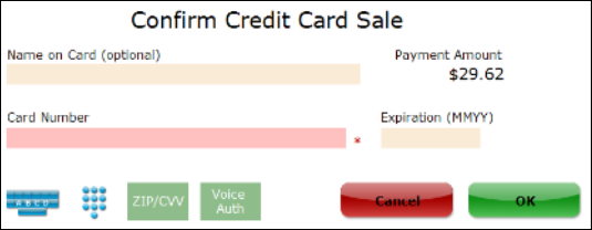 Voice Authorization: Allows you to enter transactions taken while offline. The credit card information can be inputted using the keyboard, and you will be prompted to enter the Authorization Code using the onscreen keyboard to complete the transaction.