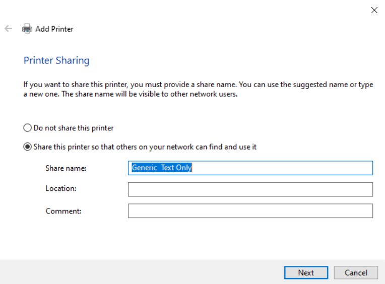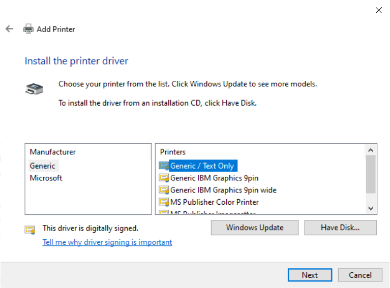 - Select the Generic / Text Only printer under manufacturer Generic, then select Next.