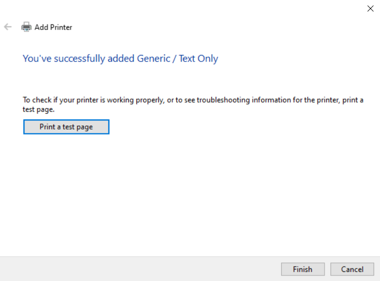 - Select Finish to complete the setup. Do Not press “Print a test page” because the baud rates have not been set up and this will most likely fail.