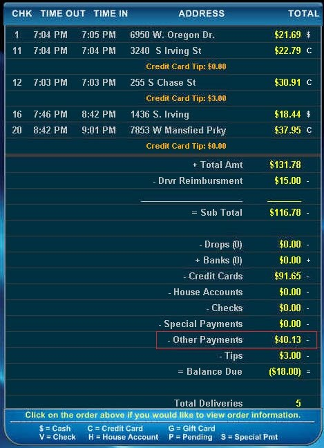 If you assigned a Delivery ticket to a driver for delivery and then close that ticket out as “Cash,” it affects the driver’s report negatively. The driver’s summary report will NOT show that sale listed in the log of sales they did. Instead, the payments for these tickets are reported to the bottom portion of the report for “Other Payments.”