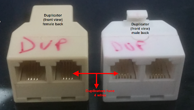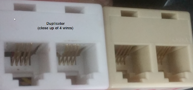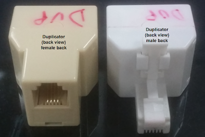 Duplicators duplicate a phone line. Essentially, it duplicates one phone signal to multiple signals. Although these duplicators pictured perform the same function, the connector on the back is different.