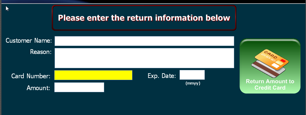 - You should be confirming the information before selecting Return Amount to Credit Card. Once you've pressed this button, this cannot be reversed through their POS system. It’s very important to make sure you are using the decimal when entering the value. If the wrong value is entered, charge the card for the difference immediately so both processes are in the same credit card batch.
