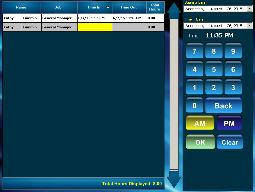 - A new line appears under the left side of the screen showing the shift you are attempting to add. There is no Punch In or Punch Out time listed because it is a new shift. Place your cursor in the Punch In field and use the virtual number pad on the right to enter the start time for the shift. If you need to add an end time for the shift select Punch Out and use the virtual number pad to enter the appropriate time. Select OK to commit.