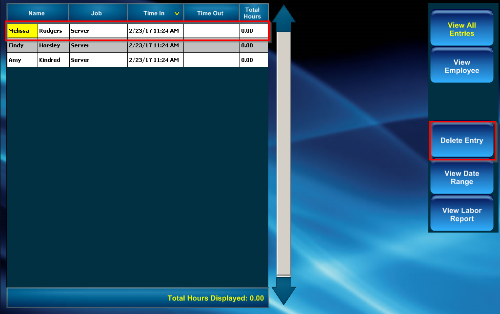 To delete a shift that is currently in the system, log in and navigate to Admin > Time Clock Functions from the main screen. Highlight an employee shift on the left side of the screen and select Delete Entry from the menu on the right.