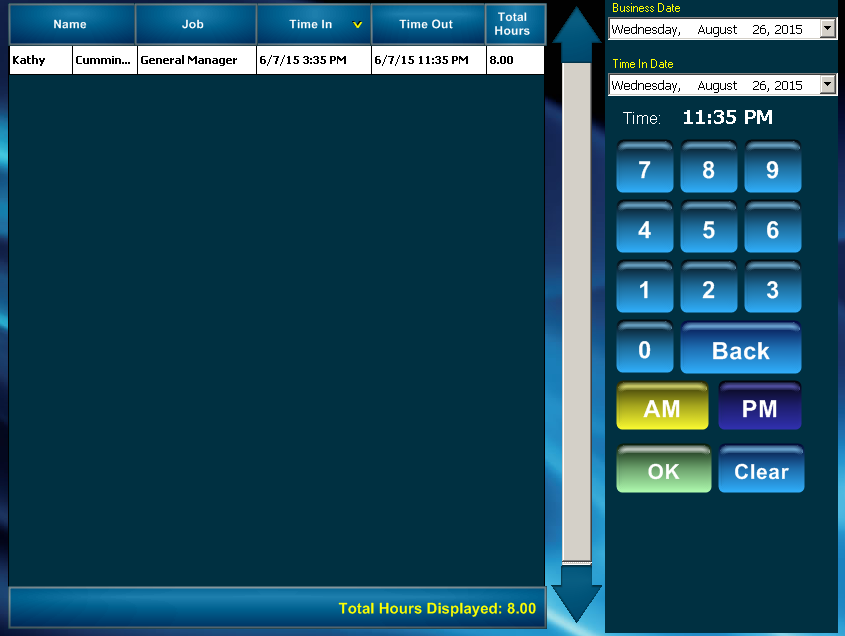 - Highlight an employee shift on the left side of the screen and tap in either the Punch In or Punch Out time of any shift and use the virtual number pad to the right to adjust the time.
