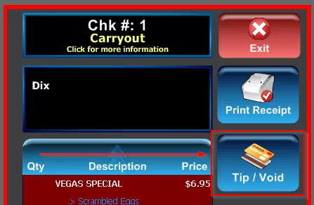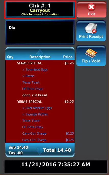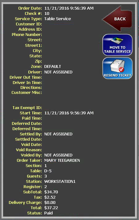 - The next screen shows all of the details regarding the check, such as the order date, totals, station, order taker, etc.
