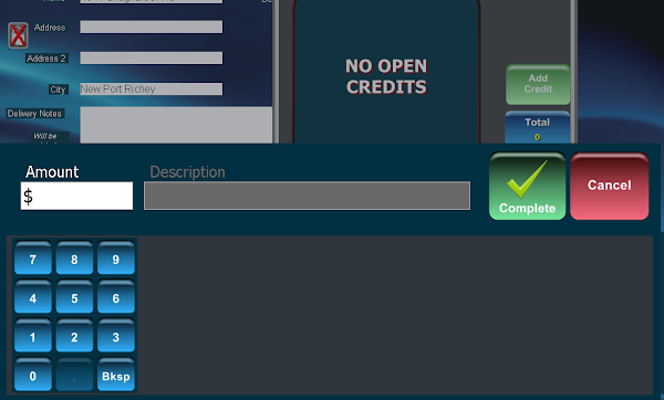 - Once the amount and description are entered, select Complete to commit the addition. If you make a mistake, follow the steps below to delete the credit.