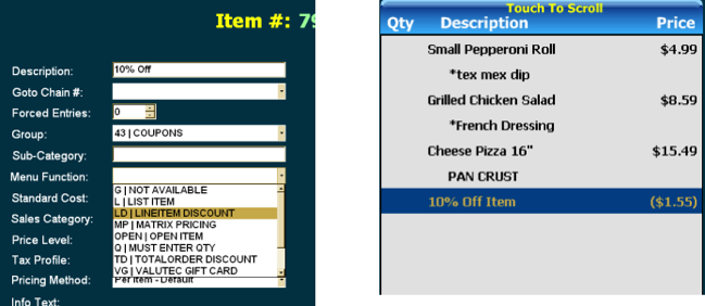 Line Item Discounts are menu buttons you can program into the order screen to take a certain percentage or dollar amount off of a single item or the entire check. This will only deduct an amount from the item ordered directly above it. Set in the price field the amount you want to discount. Anything put into that field that is less than 1 will be treated as a percentage. Anything over 1 will be treated as a dollar amount. Ex: 0.10 = 10% and 5.00 = $5.00.