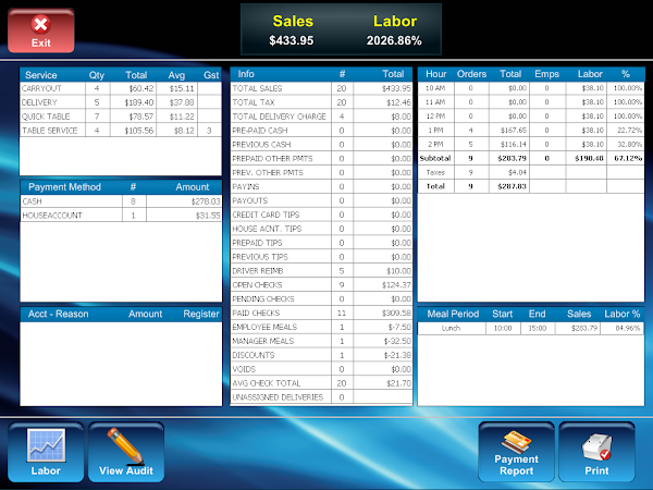 The Labor button shows the current labor for the business date, which is used in the Labor % calculation shown on the Now Report. This can be handy to quickly audit who is clocked in and how much you are paying out in labor costs.