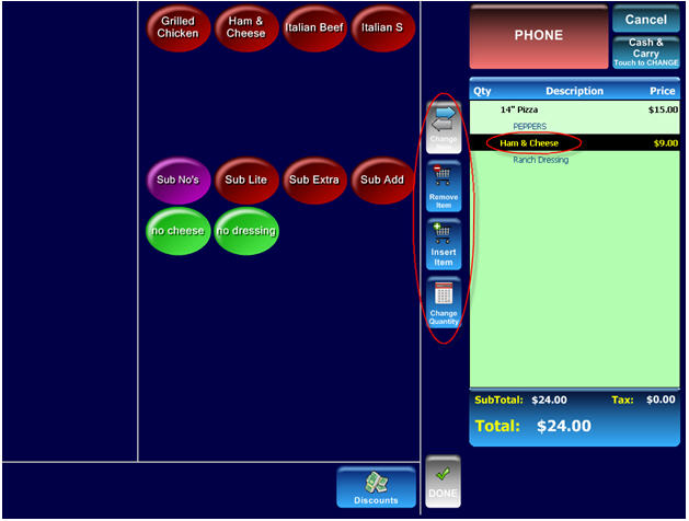 Entry Options are the options available as an order is being placed. This helps prevent you from removing items or canceling orders and starting over. To display the Entry Options, highlight an individual item from the Order Display window. This provides the following options: