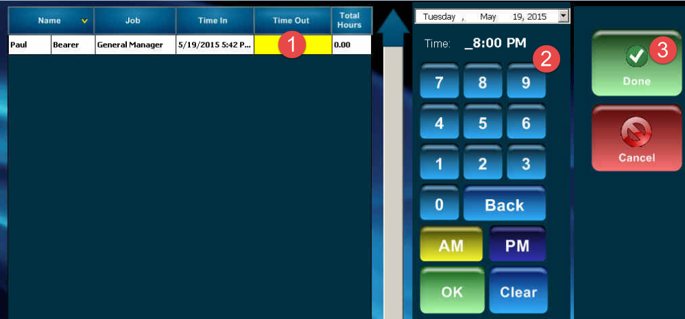 Employees can have their clock-out time set by first clicking the blank Time Out field, then typing the time when they left, and then clicking OK to set the time. It will officially clock that employee out at the designated time and continue with the EOD as usual.