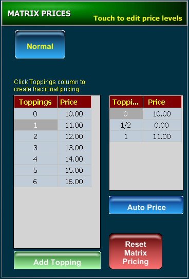 On the right side, select the number next to the Matrix Pricing level. Select 1 to view the 1/2 topping (and 1/3 and 1/4 if applicable) between 0 and 1. Repeat this all the way to 10, so apply 1/2 toppings (and 1/3 and 1/4 if applicable) for each Matrix level of pricing.