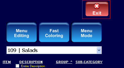 - Select the Exit button at the top to close the Menu Build screen, and then re-access this screen by pressing Menu. The reason we must do this is to reload all of the new chains we created on the Menu Screen. Otherwise, it will not show up when we attempt to attach it to a menu item.