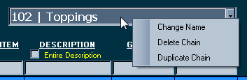 Description: Chain Mode allows you to build menus effectively in QSR & Delivery. A “Chain” is a grouping of choices and buttons. When a menu button is clicked, the software immediately “chains” to another page of options. For example, Salads often “chain” to their Dressing choices. Create a new Chain and manage Chain Mode with the instructions below.